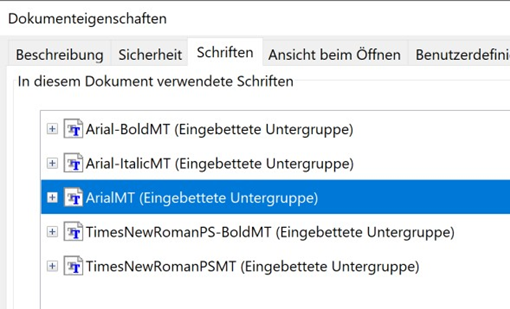 Die ERVV-Voraussetzung der Schriften-Einbettung kann man leicht prüfen, wenn man das PDF-Dokument im Adobe Acrobat Reader DC öffnet und nach Rechtsklick auf das Dokument im Kontextmenü Dokumenteneigenschaften und dann Schriften wählt.