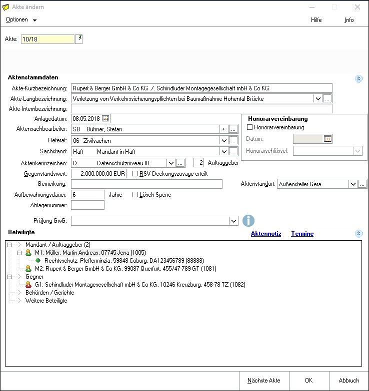 - bis zu 999 Aktenbeteiligte können pro Akte verwaltet werden.