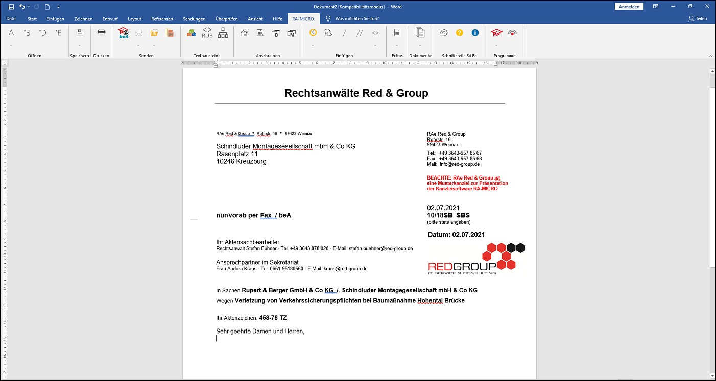 Nach Anpassung der Paltzhaltern in den Briefköpfen werden die erweiterten Aktendaten natürlich auch in die Schriftsätze der Kanzlei übernommen.