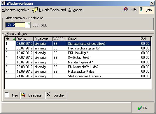 - bis zu 9 Wiedervorlagen können pro Akte hinterlegt werden.