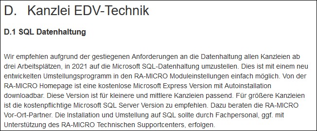An der Empfehlung von RA-MICRO zur Umstellung auf SQL Datensopeicherung hat sich auch 2021 nichts geändert. Gerade bei intensiver Nutzung der elektronischen Akte machen sich die Vorteile der SQL Datenspeicherung bemerkbar. Daher hat RA-MICRO das Thema SQL Datenspeicherung im Anwenderrundschreiben 2021 erneut thematisiert und weißt Kunden mit großen E-Akte Datenbeständen aktiv auf die Vorteile einer SQL Umstellung hin, siehe https://2021.ra-micro.de/#20