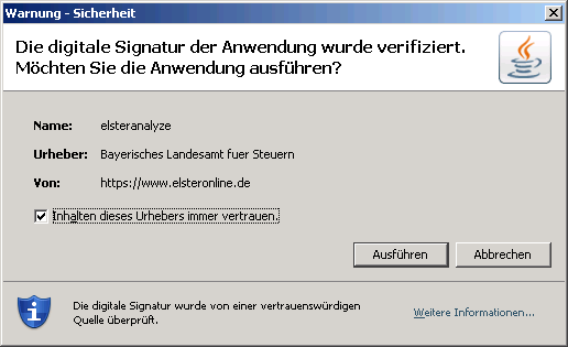 ... https://www.elsteronline.de . Nach Klick auf Schritt 2 kann folgende Meldung erscheinen die Sie bitte bestätigen: