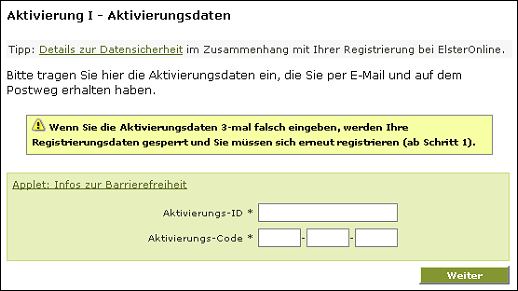 Ihre Aktivierungs-ID und den Aktivierungs-Code erhalten Sie wenige Tage später per Post. Nach Erhalt dieser Codes können Sie mit Schritt 2 forfahren.