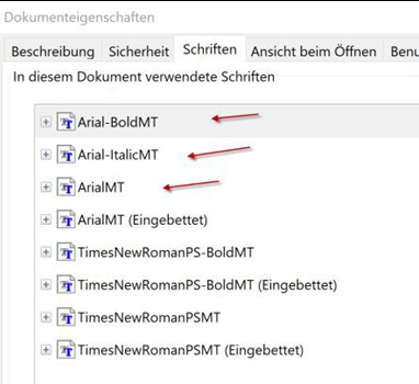 Die ERVV-Voraussetzung der Schriften-Einbettung kann man leicht prüfen, wenn man das PDF-Dokument im Adobe Acrobat Reader DC öffnet und nach Rechtsklick auf das Dokument im Kontextmenü Dokumenteneigenschaften und dann Schriften wählt.