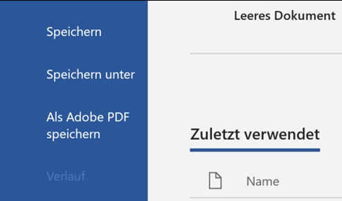 Man installiert auf dem PC-Arbeitsplatz das Programm Adobe Acrobat DC, die mit ca. 13 Euro monatlich kostenpflichtige Variante des allgemein genutzten Adobe Acrobat Readers. Dann besteht im Word-Menü „Datei“ die zusätzliche Möglichkeit, ein Dokument als Adobe PDF zu speichern.