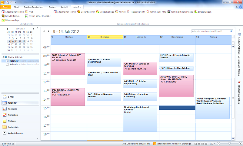 Und durch Einbindung des ra-micro Outlook Add-In wird das Eintragen von Terminen für Nutzer der ra-micro Kanzleisoftware besonders einfach. Hier können nach Eingabe des Aktenzeichens alle für einen Termineintrag wichtigen Aktendaten übernommen werden. Dabei unterscheidet das Add-In sogar zwischen Gerichtsterminen und allgemeinen Terminen. So haben Sie bei einem Gerichtstermin zum Beispiel das gerichtliche Aktenzeichen und den Raum der Verhandlung bereits im Termin hinterlegt.
