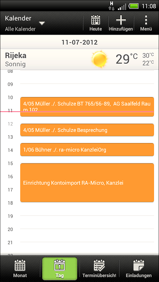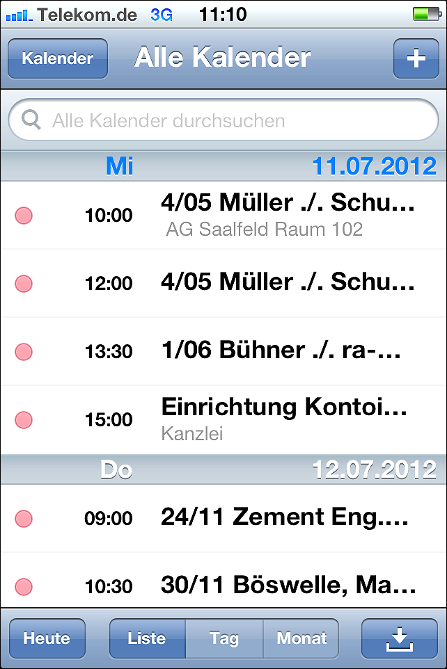 Und wie sieht das ganze dann aus? Anbei haben wir als Beispiel Screenshots des Kanzleikalenders von einem iPhone 4 (Apple iOS) und einem HTC One S (Android 4) als Bilder angefügt.