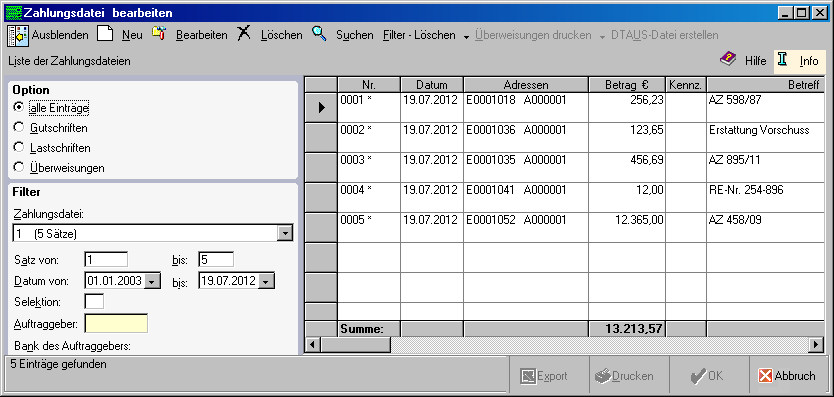 Sie können bis zu 99 Zahlungsdateien anlegen und diese je nach Verwendung – Gutschrift, Lastschrift oder Bankkonten - unterschiedlich bezeichnen. Sie können die Zahlungsdateien ebenso verschiedenen Konten zuordnen um dann Überweisungen durch die Rechtsanwälte freigeben zu lassen. Lassen Sie sich alle erfassten Einträge bzw. Gut- und Lastschriften oder Überweisungen anzeigen, um z. B. eine DTAUS-Datei zu erstellen. Diese kann ebenfalls online per HBCI versandt oder per Datenträger an die Bank weitergegeben werden. Die DTAUS-Datei kann auch gedruckt und in Papierform an die Bank übermittelt werden. Alternativ können Zahlungsaufträge über einen zuvor eingerichteten HBCI-Homebanking-Kontakt als Einzel- oder Sammelüberweisungen online verarbeitet werden. Überweisungs- und Scheckformulare werden am Bildschirm dargestellt und mit Hilfe bereits gespeicherter Adressen automatisch ausgefüllt.