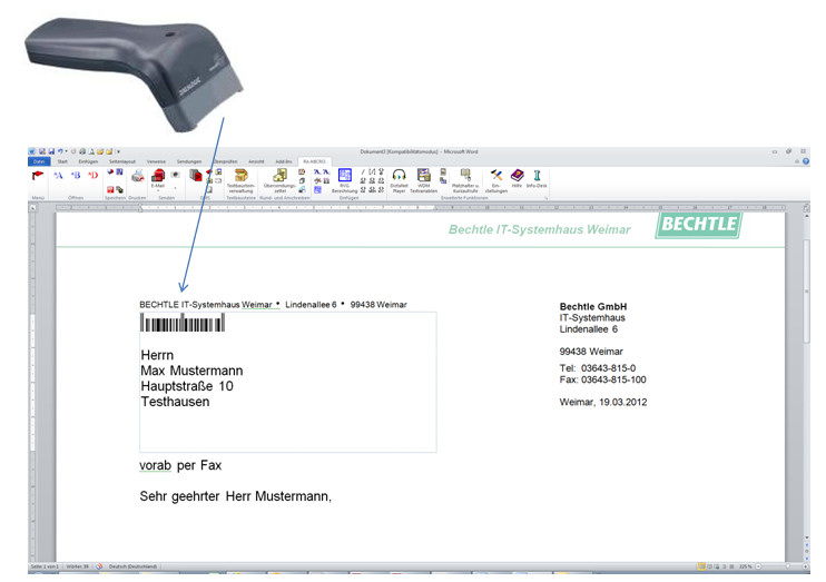 Anpassung im ra-micro: Das Programmmodul zur Portokostenerfassung mit Barcodescanner gehört zum Lieferumfang von ra-micro. Es fallen daher keine zusätzlichen Lizenzkosten an. Zur Nutzung der Portokostenerfassung im ra-micro bedarf es lediglich einer Anpassung des Briefkopfes - hier wird durch einen speziellen Platzhalter ein Barcodefeld eingefügt - sowie einer Schulung der Mitarbeiter in die Benutzung des Scanner und dem Erfassen bzw. Verbuchen der Portokosten.