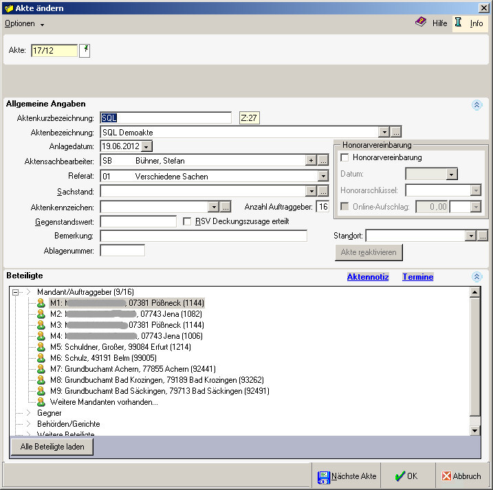 - bis zu 999 Aktenbeteiligte können pro Akte verwaltet werden.